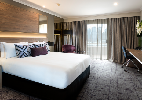Spacious rooms offering one Queen bed and a private walkout balcony with stunning views of the Brisbane River and city skyline.